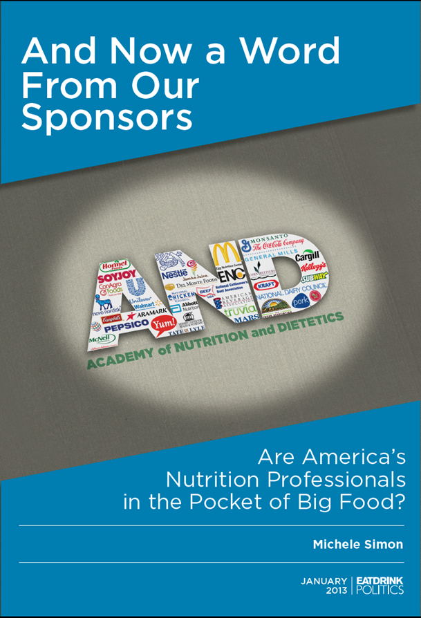 [R]egardless if they are real or perceived, the influence of Academy corporate sponsors has not only sparked scrutiny among journalists, but has led to several conversations in which members have had to defend these relationships and the profession at national conferences and forums. These confrontations have led to rising humiliation and a growing discomfort while fulfilling the role as Delegates. In some instances, this has led to long-‐time members leaving the organization. We urge the Academy to uphold more transparent and stricter guidelines on access of corporate sponsors to Academy leadership and to remove their presence at meetings, such as HOD [the AND House of Delegates], in which decisions about the profession and/or the organization are made. This will avoid conflict of interest, advance transparency, maintain professional and organizational integrity, and establish a more credible national presence.It is difficult for any professional association to find a business model that works, providing needed support for association activities without conflicts of interests. For example, the HEN practice group itself last year sought to develop its own policies for sponsorships (.pdf), describing the ideal potential sponsors as companies with a combination of nutrition and environmental virtues. I wish them well finding such terrific sponsors, but, realistically, we should admit that giving up compromised sponsorships may imply accepting a smaller scale of operation and revenue for a professional association.